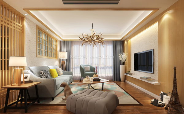 繁杂的树脂灯和花色地毯调理了素雅空间的活跃空气。灵动天然。清爽的浅蓝布艺沙发承担了空间的舒服慵懒,透着厚沉感。日式气概也是不少业从喜好!