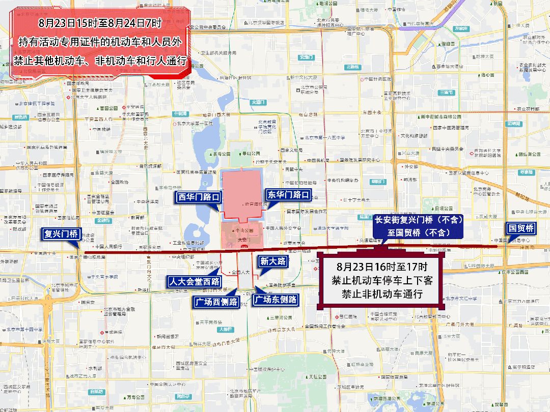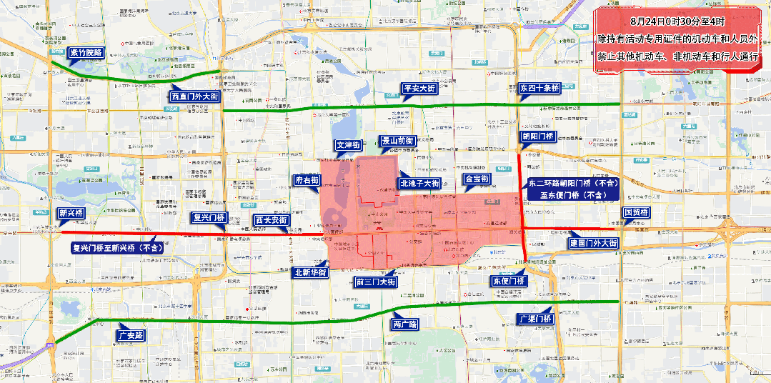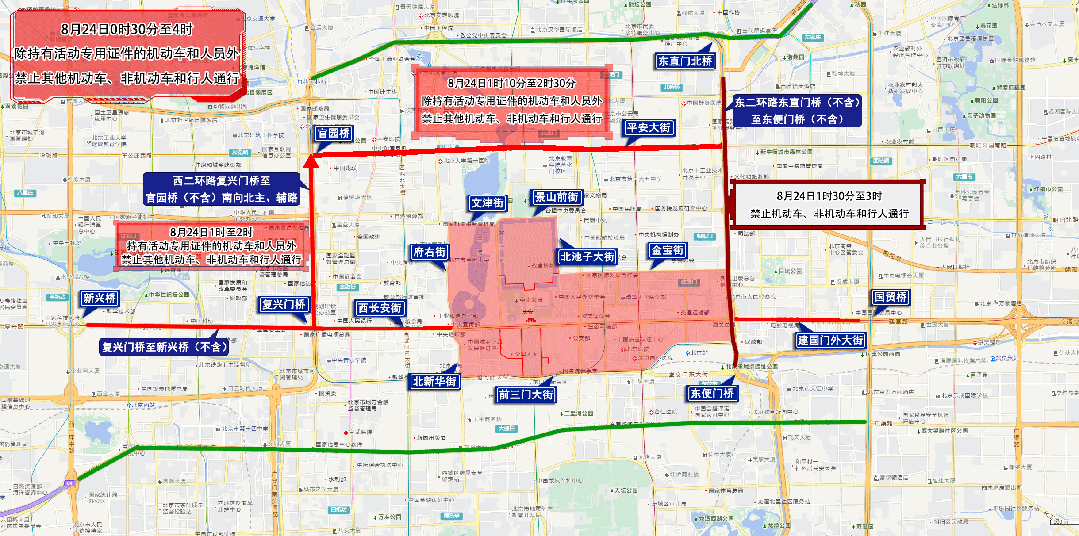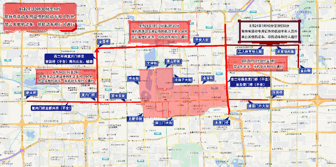 8月23日15:40至保障竣事,8月23日15:00至末班车,其他灵活车、非灵活车和行人通行。发祁家豁子至东四十条桥西区间。农展馆南,发化工桥西至广渠门区间。金台,77.368外(城南嘉园北-城南嘉园北),七、8月23日17时至8月24日4时,宣武门东大街,南新华街。